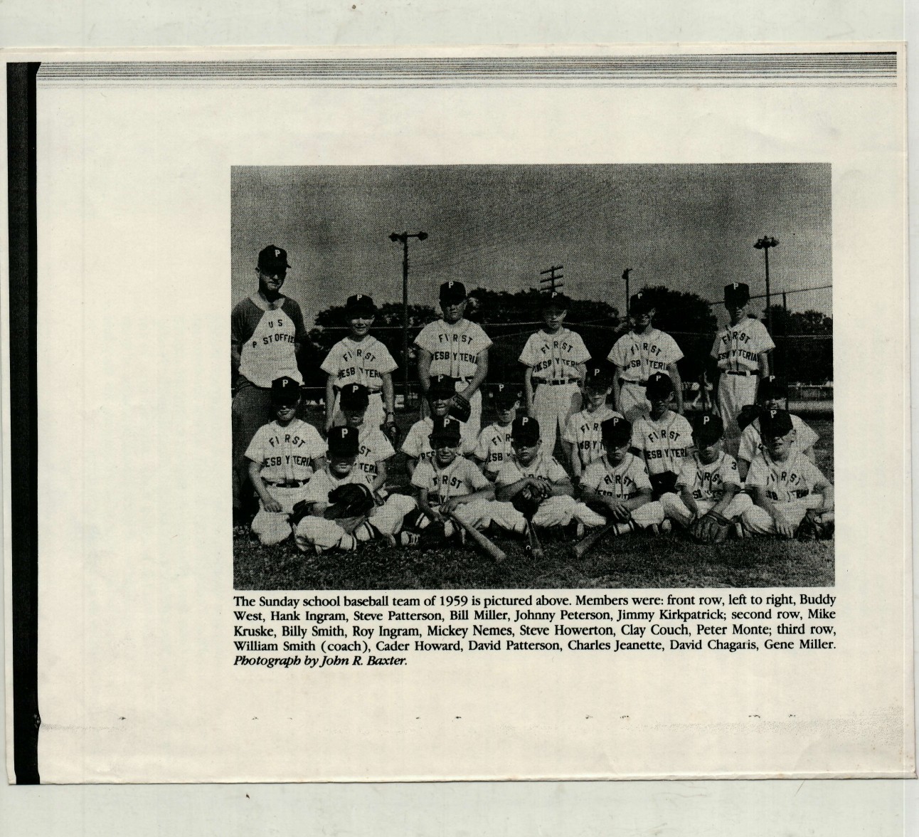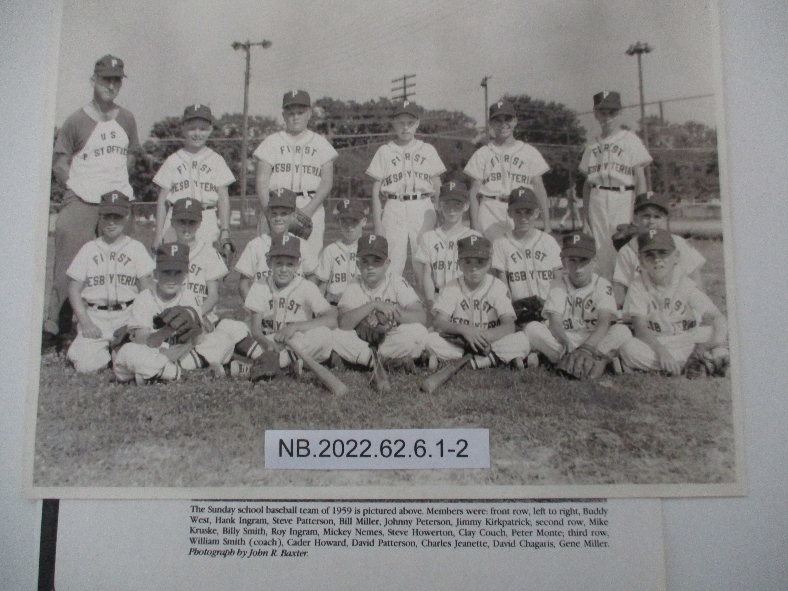 A 1959 photograph of the First Presbyterian Sunday school baseball team from New Bern, NC, featuring players and coaches in their team uniforms.
