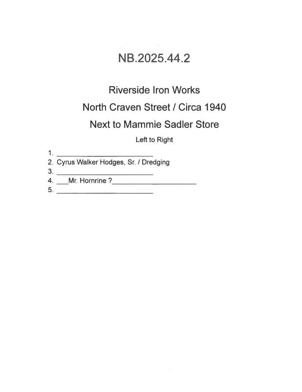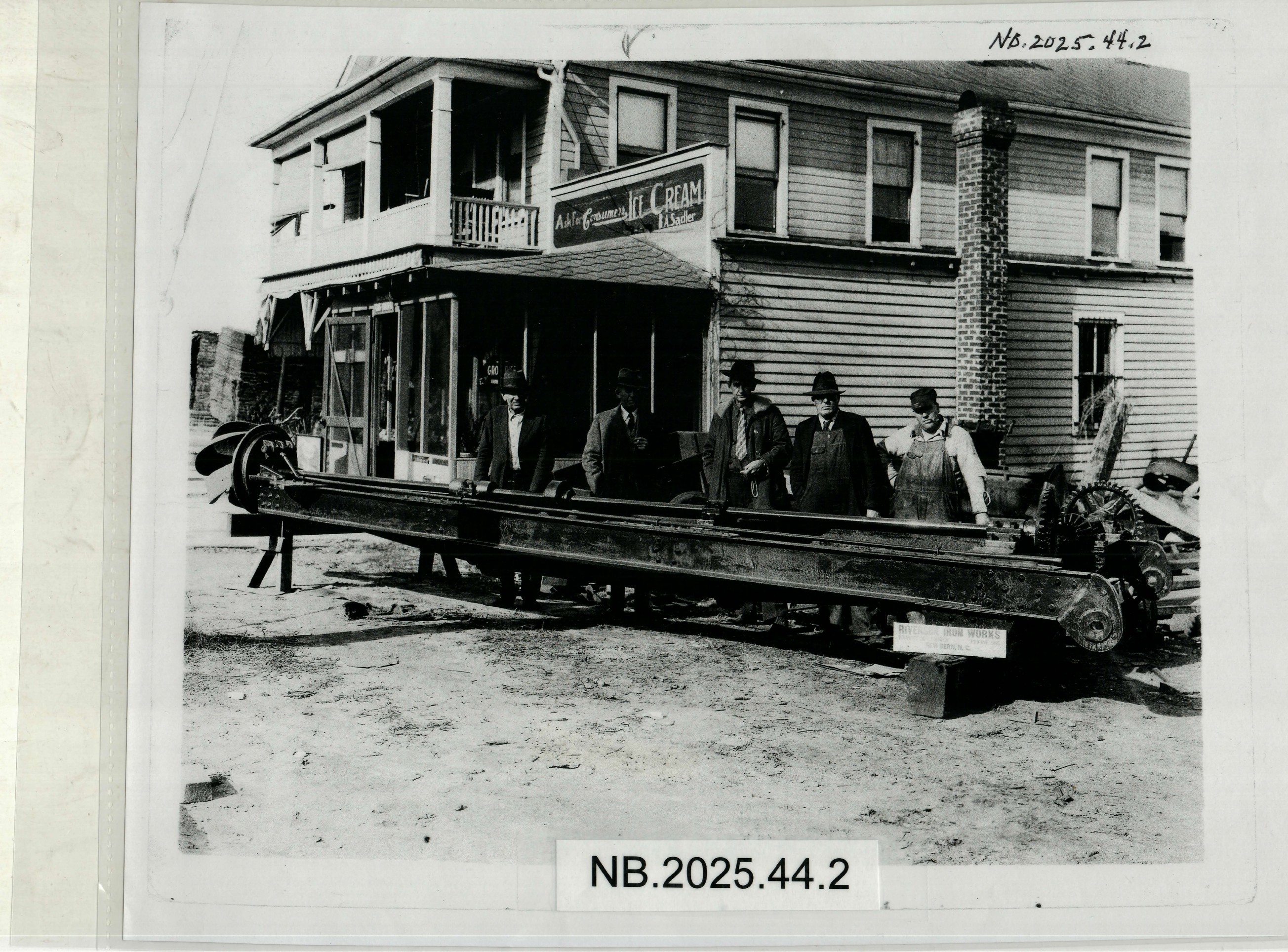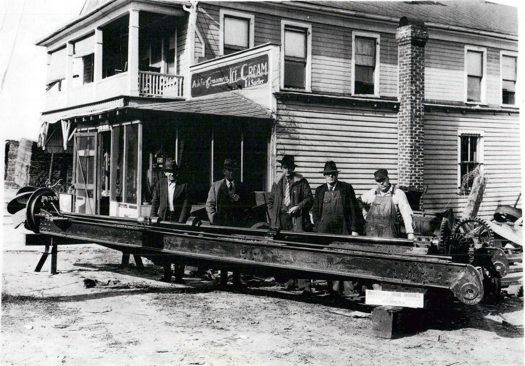 Historical photo outside Riverside Iron Works in New Bern, NC, showing men standing behind fabricated dredging equipment. The Mamie Sadler store on North Craven Street is on the left.