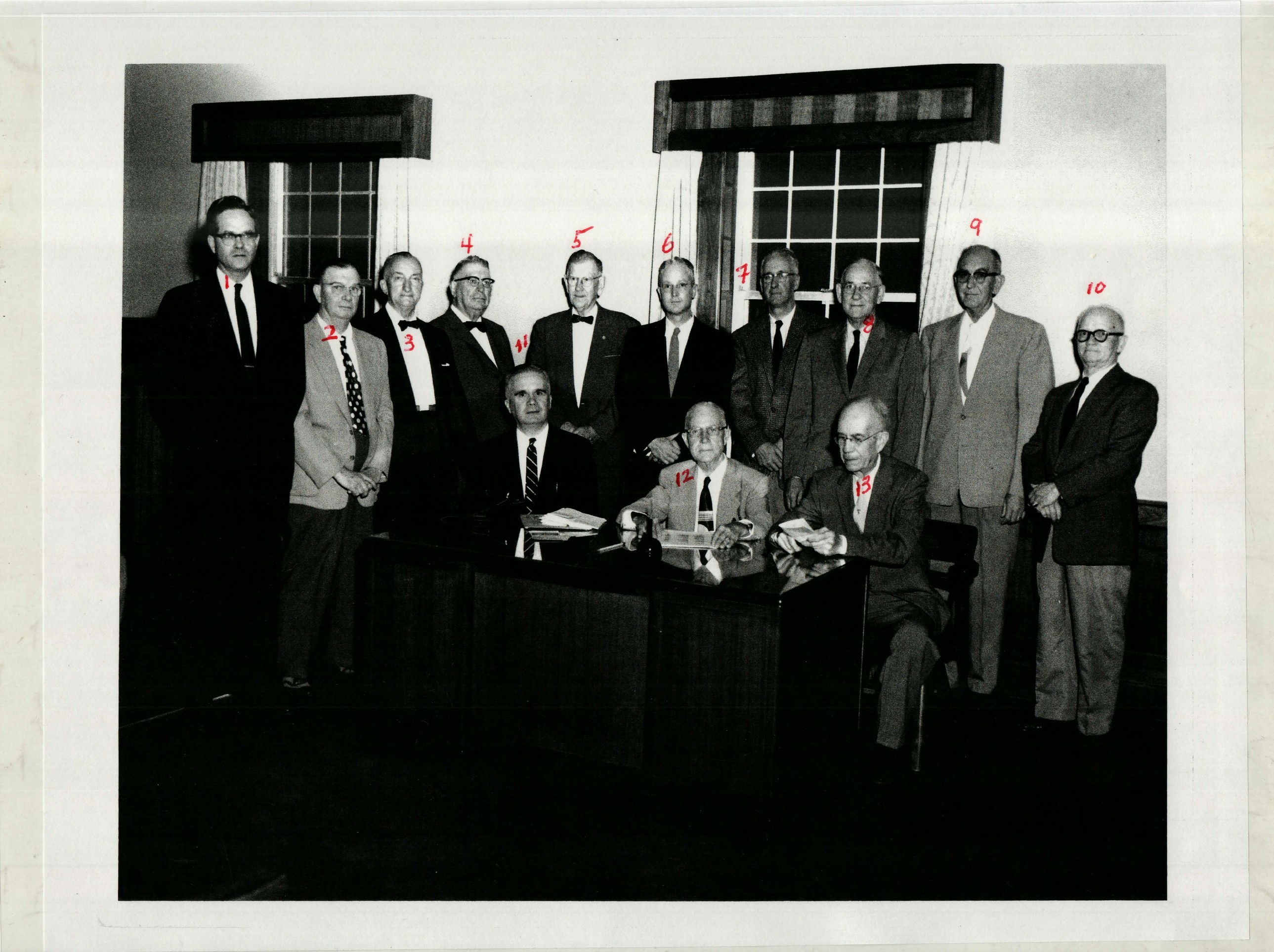Officers & Directors / 1957, 1. Mark Dunn, 2. Joe Lucas, 3. R.L. Stallings, 4. N.E. Mohn ?, 5. John Parker, 6. C. McCotter, 7. Floyd Gaskins, 8. J.C. Bagg, 9. _____________, 10. John R. Taylor, 11. John Dunn, Jr., 12. Will Dowdy, 13. John Dunn, Sr.