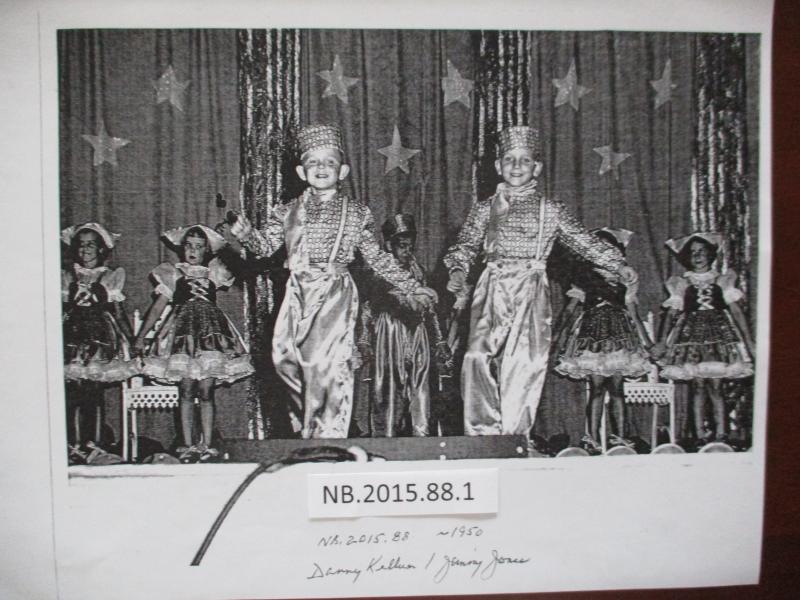 A black and white photo capturing Danny Kellum and Jimmy Jones in a theatrical performance, adorned in elaborate costumes, circa 1950, New Bern, NC.