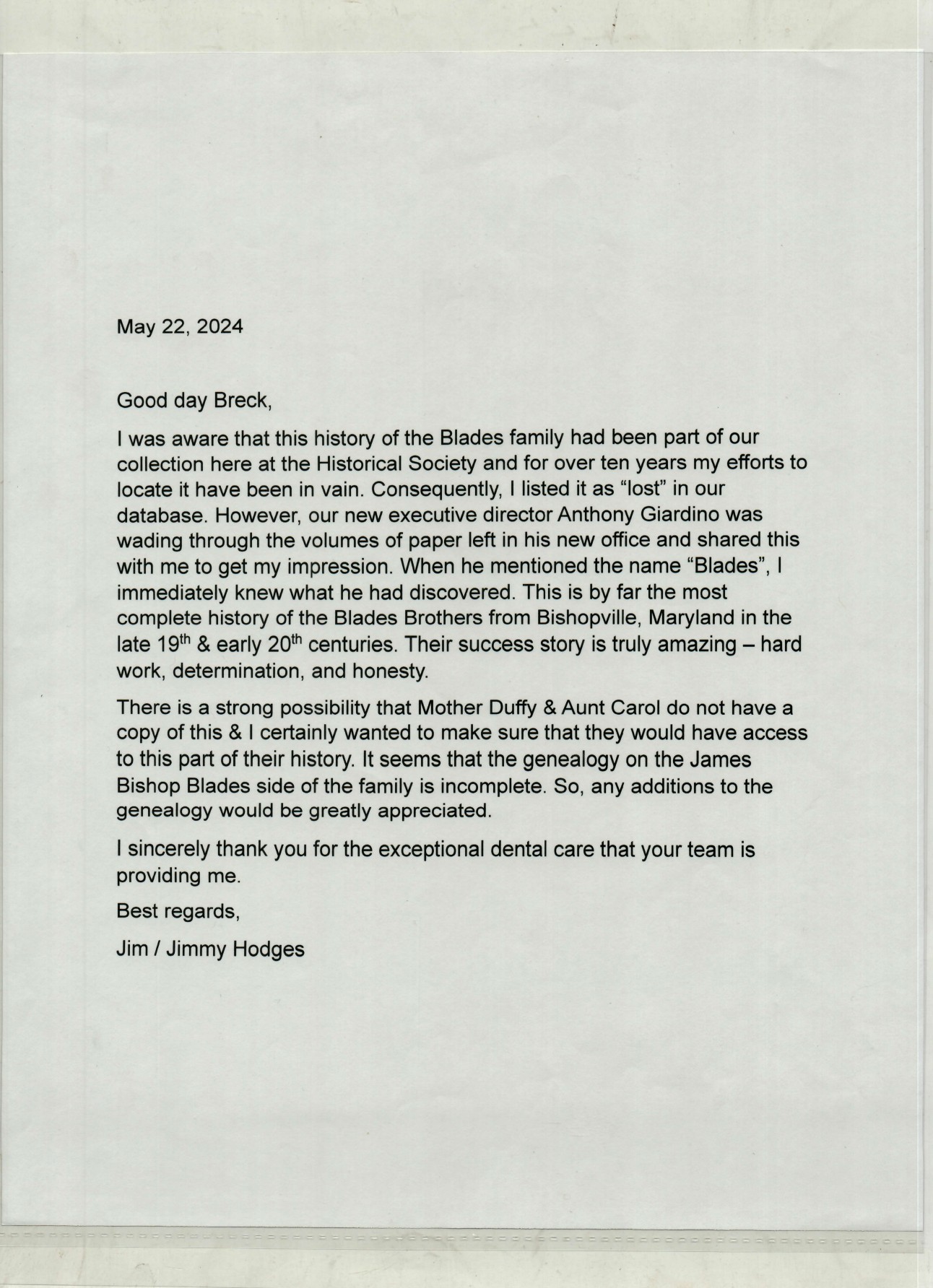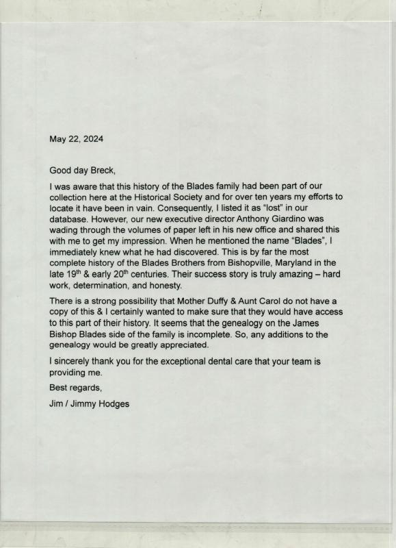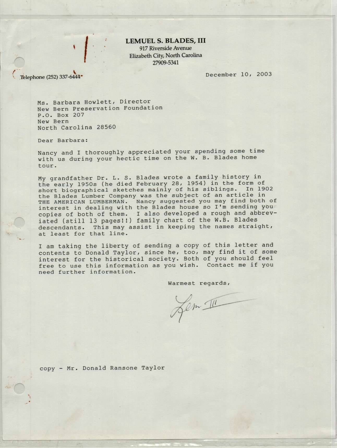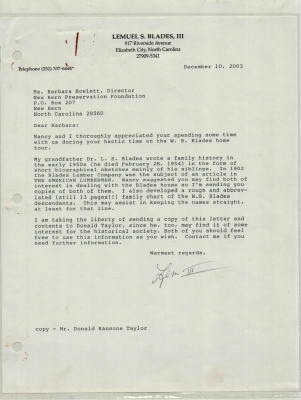 A 2003 letter from Lemuel S. Blades III discussing his grandfather's historical works and family genealogy, intended for the New Bern Preservation Foundation and the New Bern Historical Society. Also, a 2024 letter to Dr. Breck Gibbs, great-great-grandson of James Bishop Blades from Historical Society Curator, Jim Hodges, sharing the rediscovery of the Blades Family History compiled by Dr. L.S. Blades in Elizabeth City, NC.