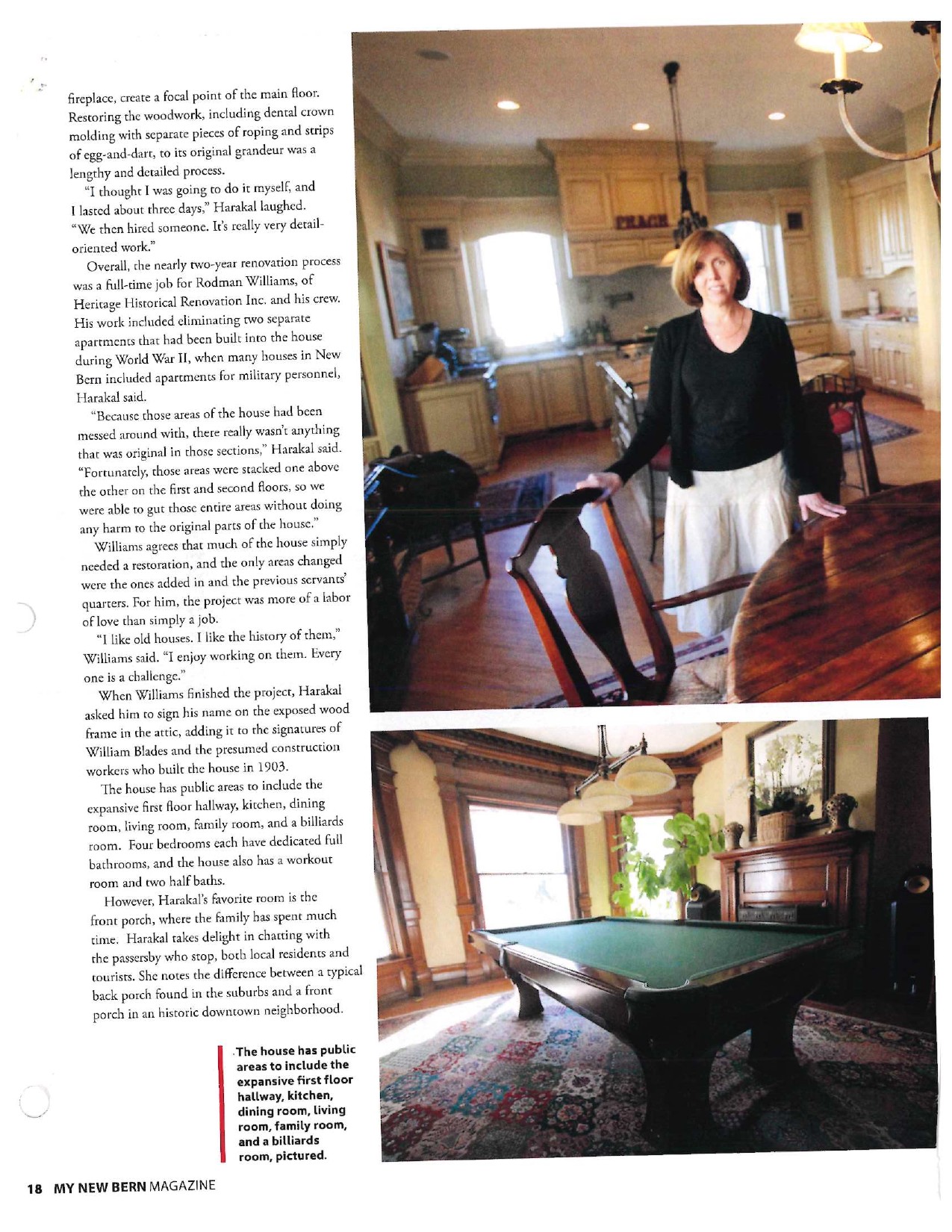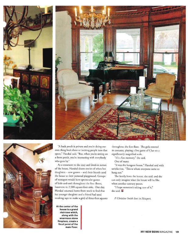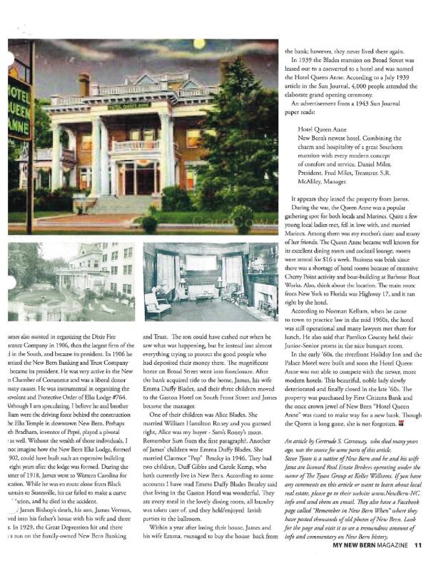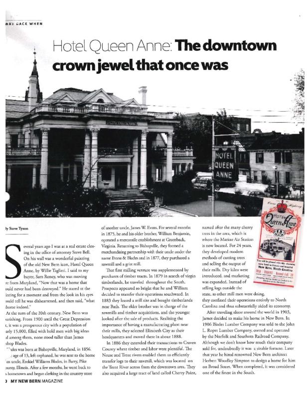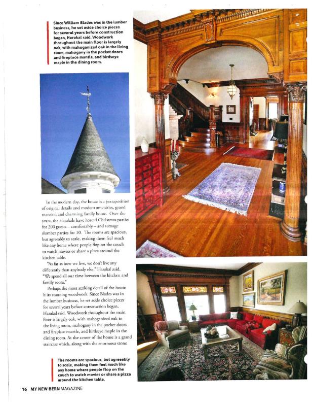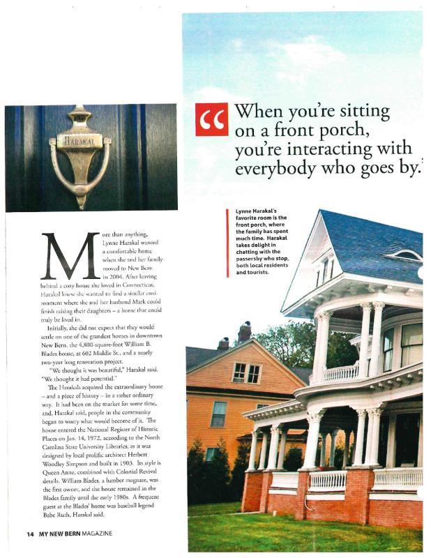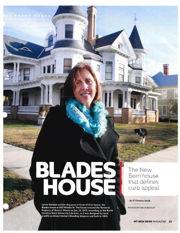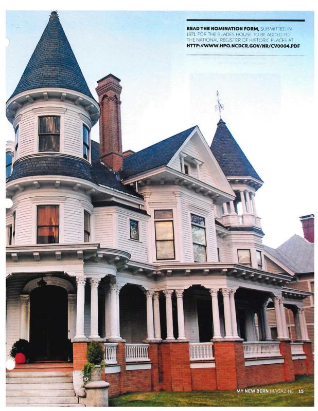 Historic Blades House in New Bern, NC, featuring its intricate Queen Anne style architecture, designed by Herbert Woodley Simpson in 1903 and listed on the National Register of Historic Places. Two articles presented that highlight the most recent restoration of the W.B. Blades House by current owners, the Harakal Family, and a brief history of the James Bishop Blades House, AKA Hotel Queen Anne.
