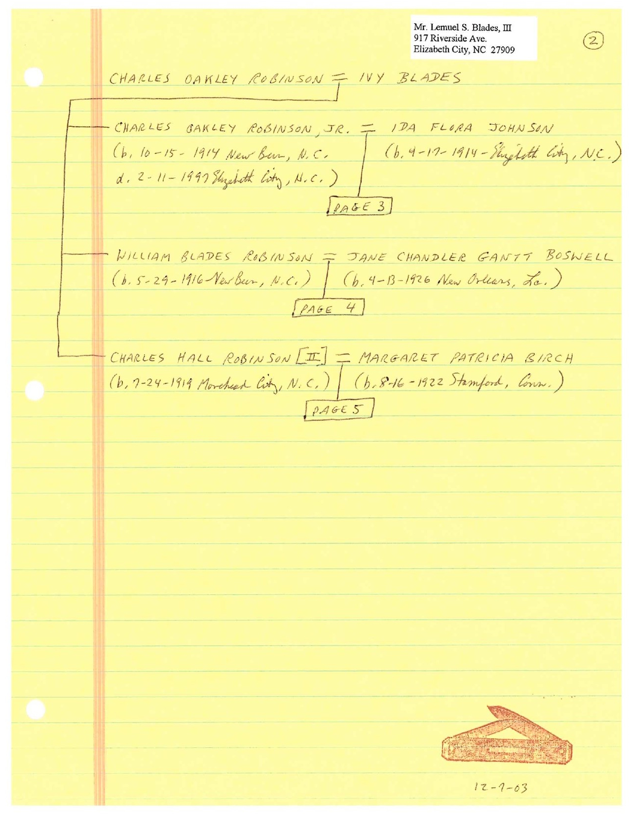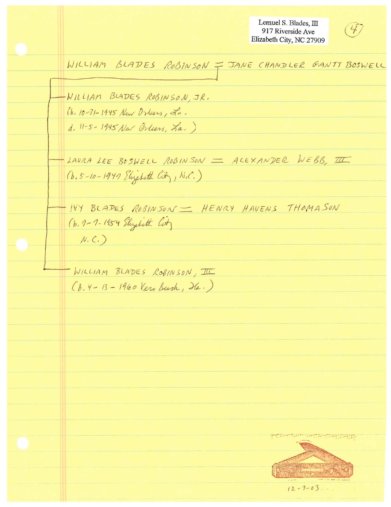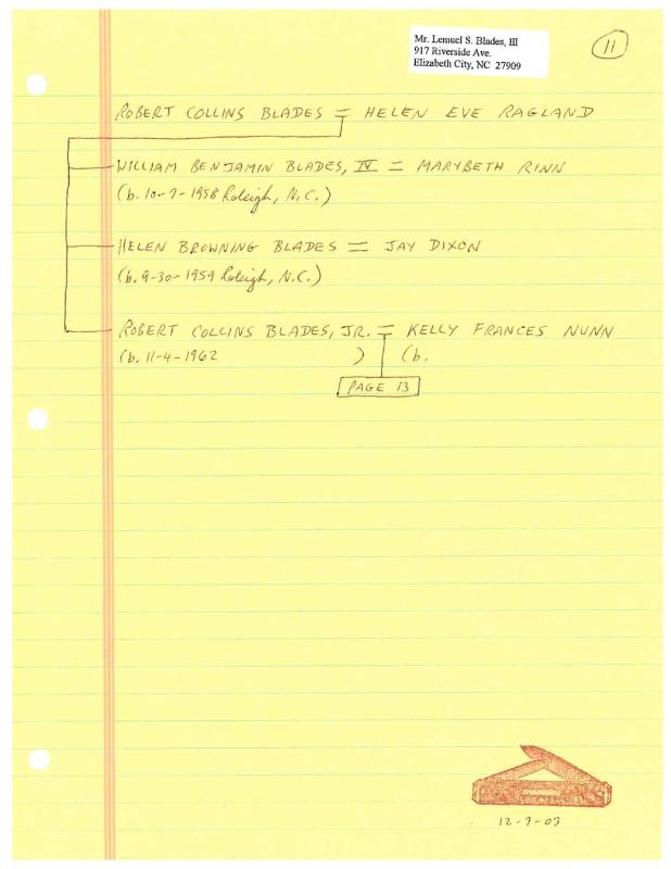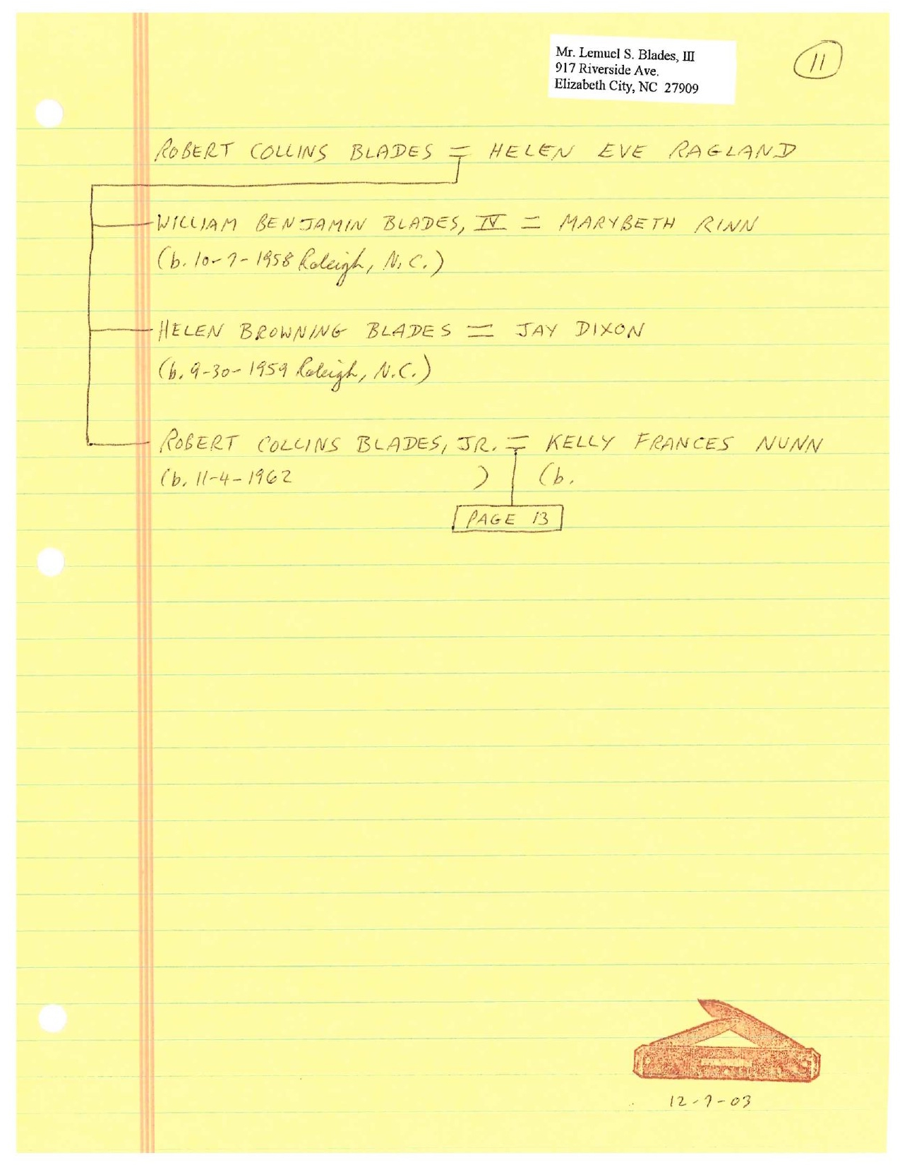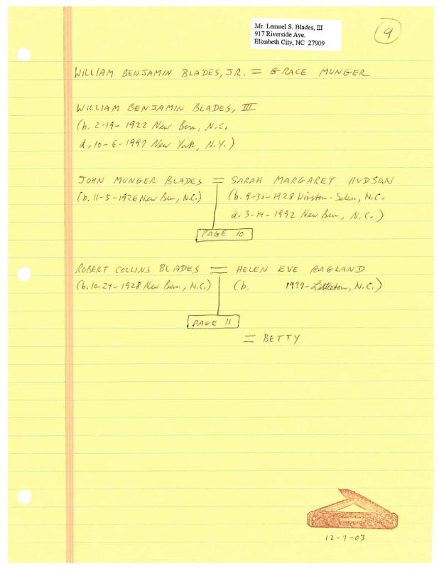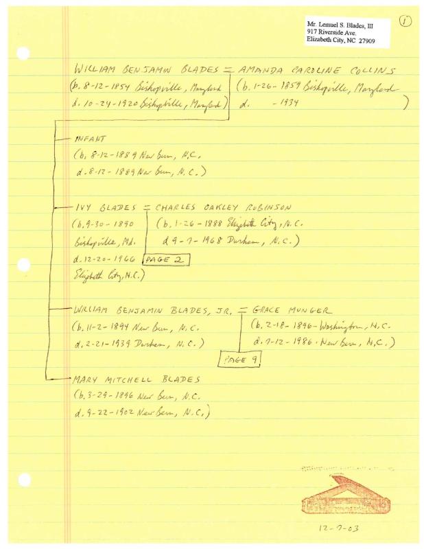 A detailed genealogical record of the Blades family, tracing roots in New Bern, NC, and Bishopville, MD, from the late 19th to mid-20th century prepared by L.S. Blades, III.