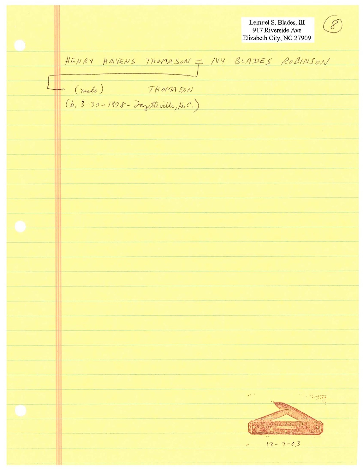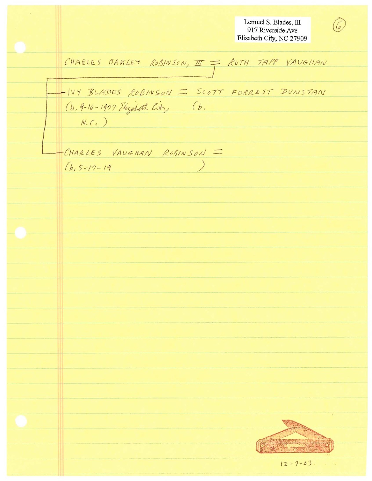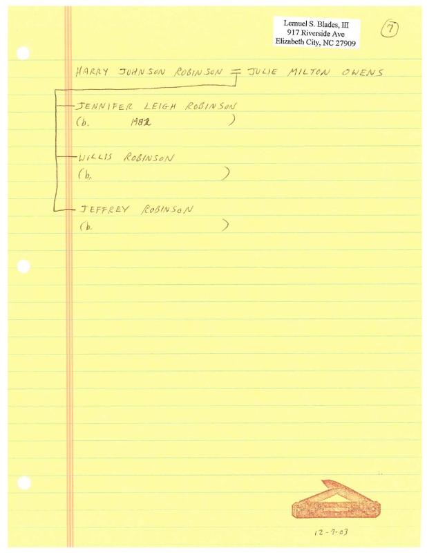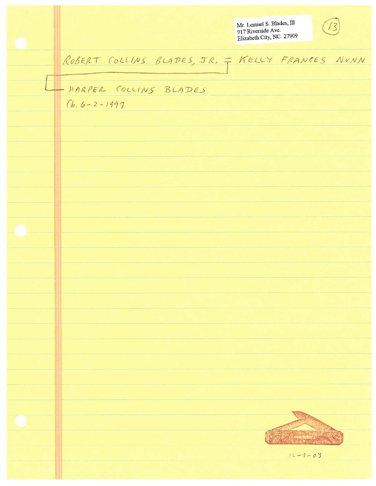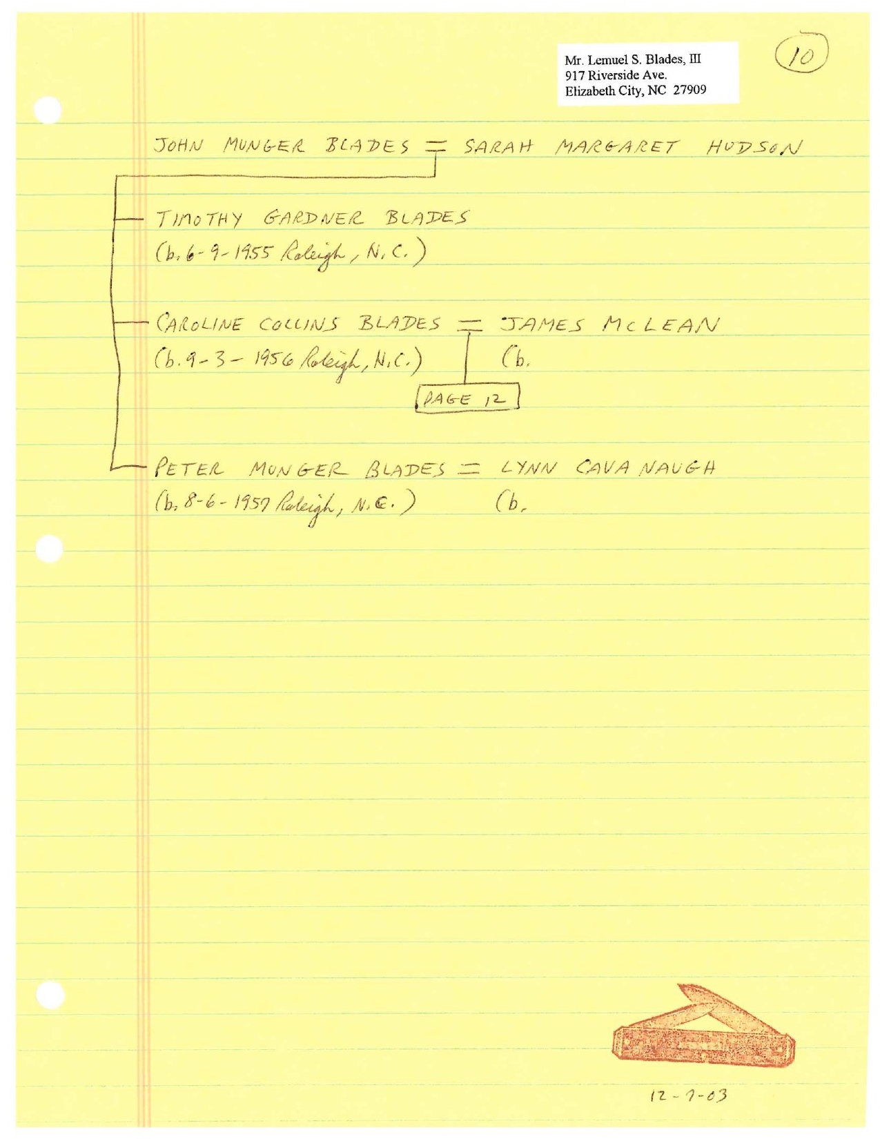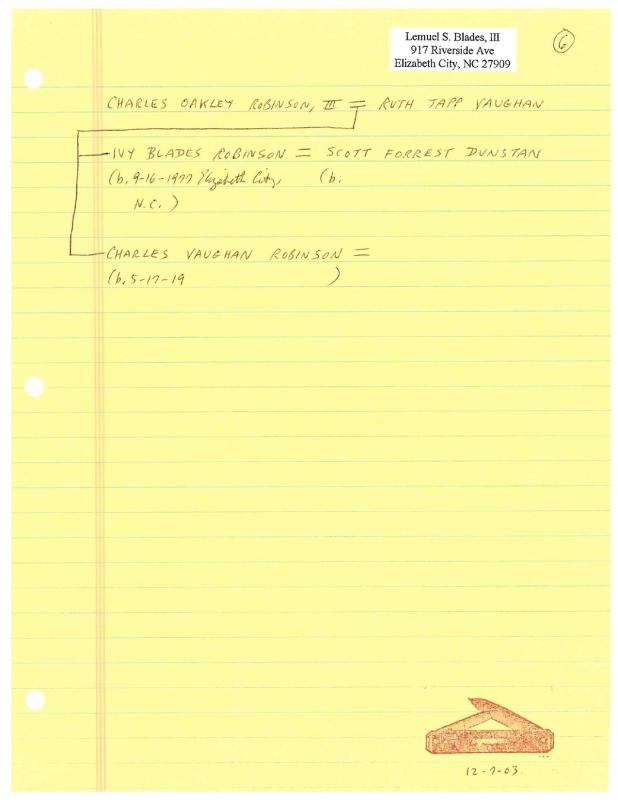 A detailed genealogical record of the Blades family, tracing roots in New Bern, NC, and Bishopville, MD, from the late 19th to mid-20th century prepared by L.S. Blades, III.