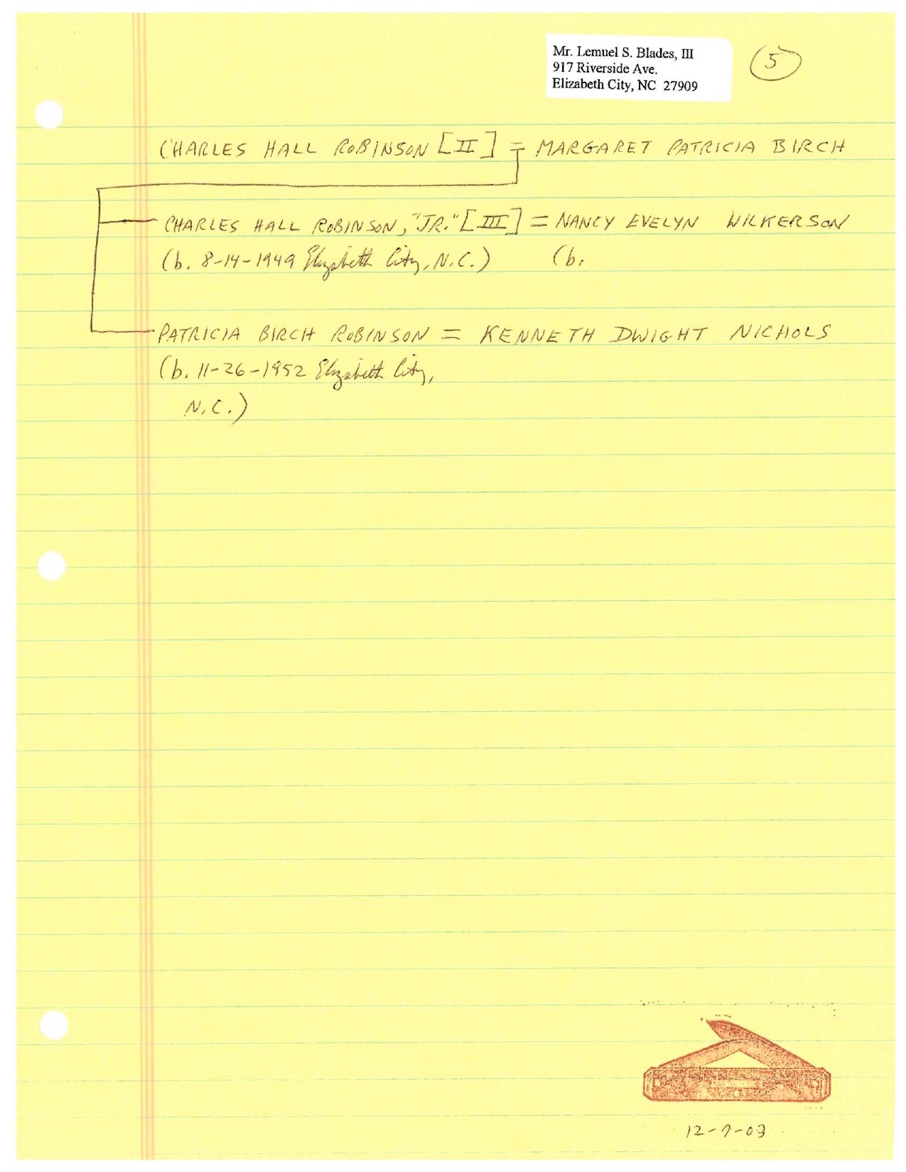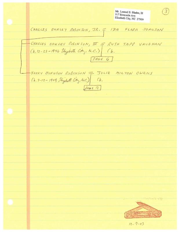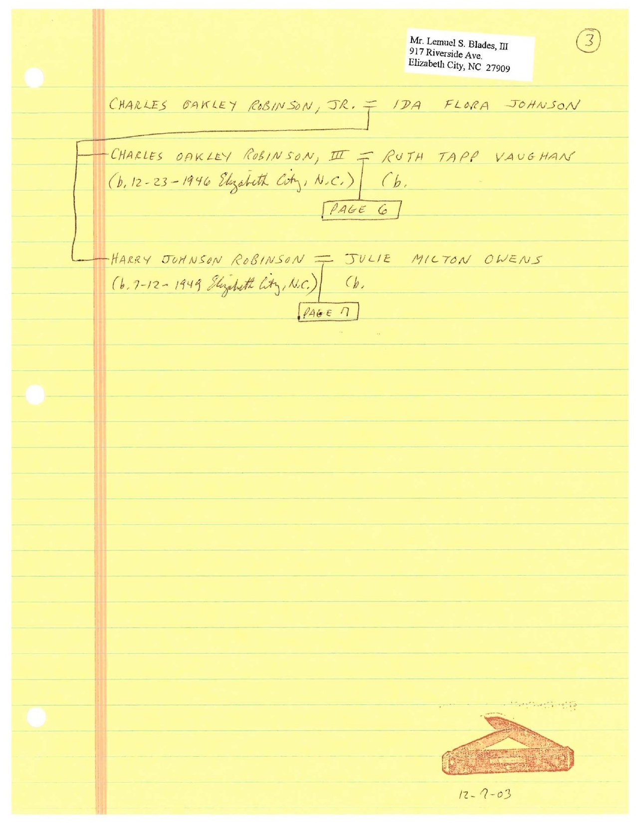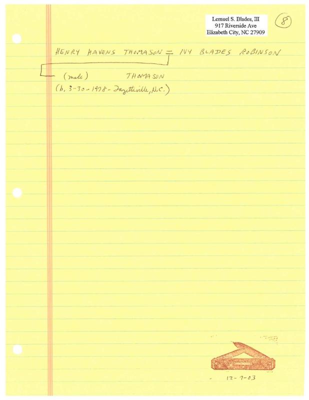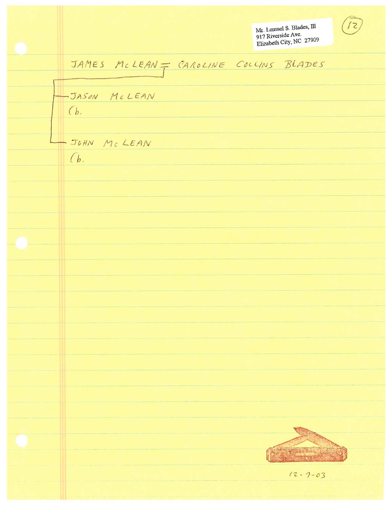 A detailed genealogical record of the Blades family, tracing roots in New Bern, NC, and Bishopville, MD, from the late 19th to mid-20th century prepared by L.S. Blades, III.