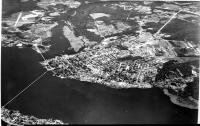 Aerial View of New Bern, NC Vintage aerial photograph showcasing the industrial and residential areas of New Bern, North Carolina, with clear views of roads, buildings, and waterfronts. -