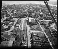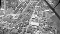 Aerial View of New Bern's Depot Area Historic aerial photograph showcasing the extensive railroad infrastructure and surrounding community in New Bern, NC. Notable features include multiple rail tracks and depot buildings. -