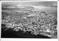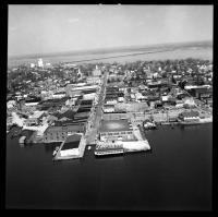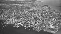 Historical Aerial View of Downtown New Bern Aerial photograph capturing the expansive waterfront and densely packed urban landscape of downtown New Bern, NC. -