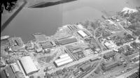 Riverside Waterfront, New Bern, NC Historical aerial view of Riverside Waterfront in New Bern, showing industrial buildings along the river, docked boats, and adjacent rural landscapes. -